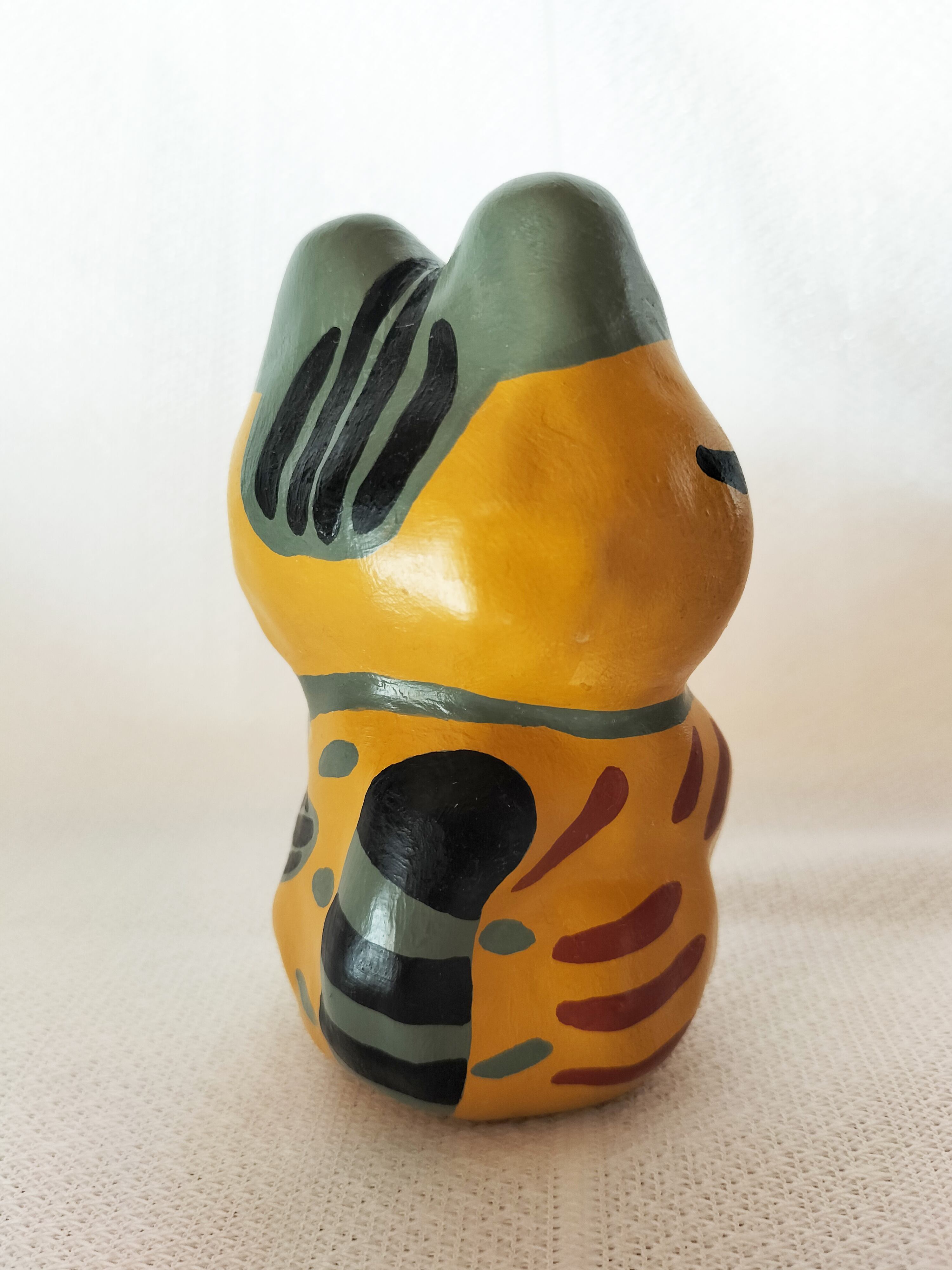 地域猫としてお世話していたさび柄の女の子びびちゃんをモデルに作った張り子の猫です。