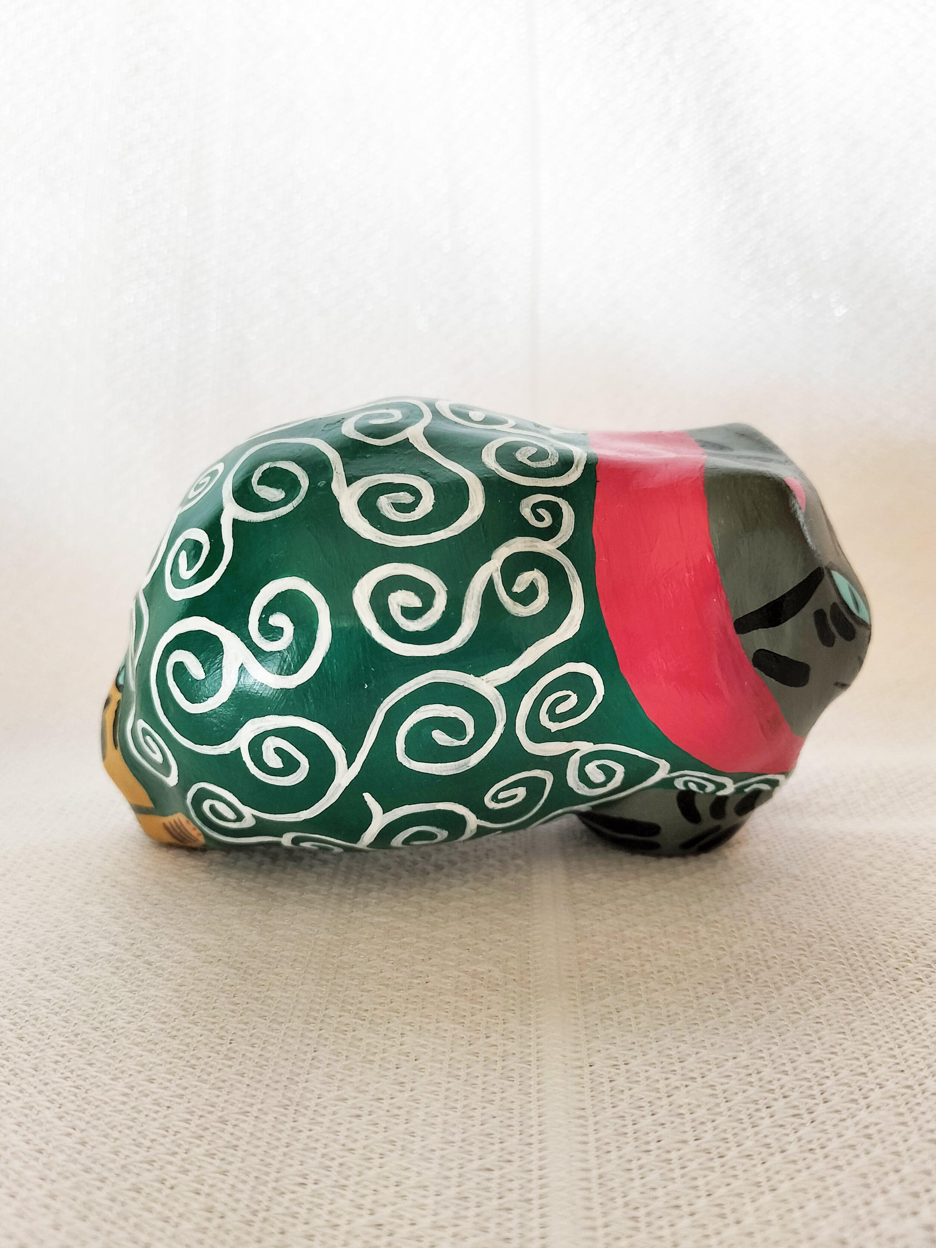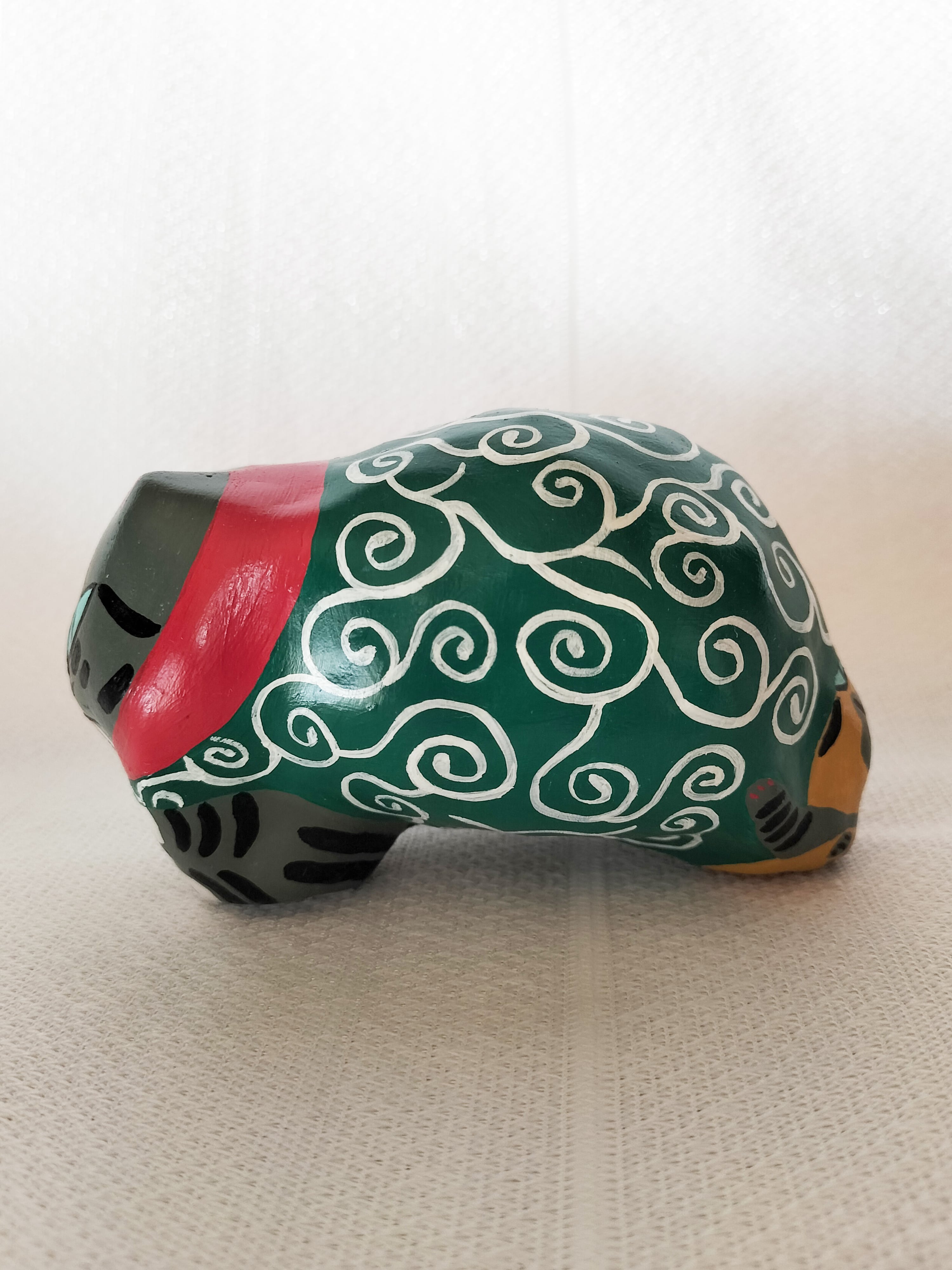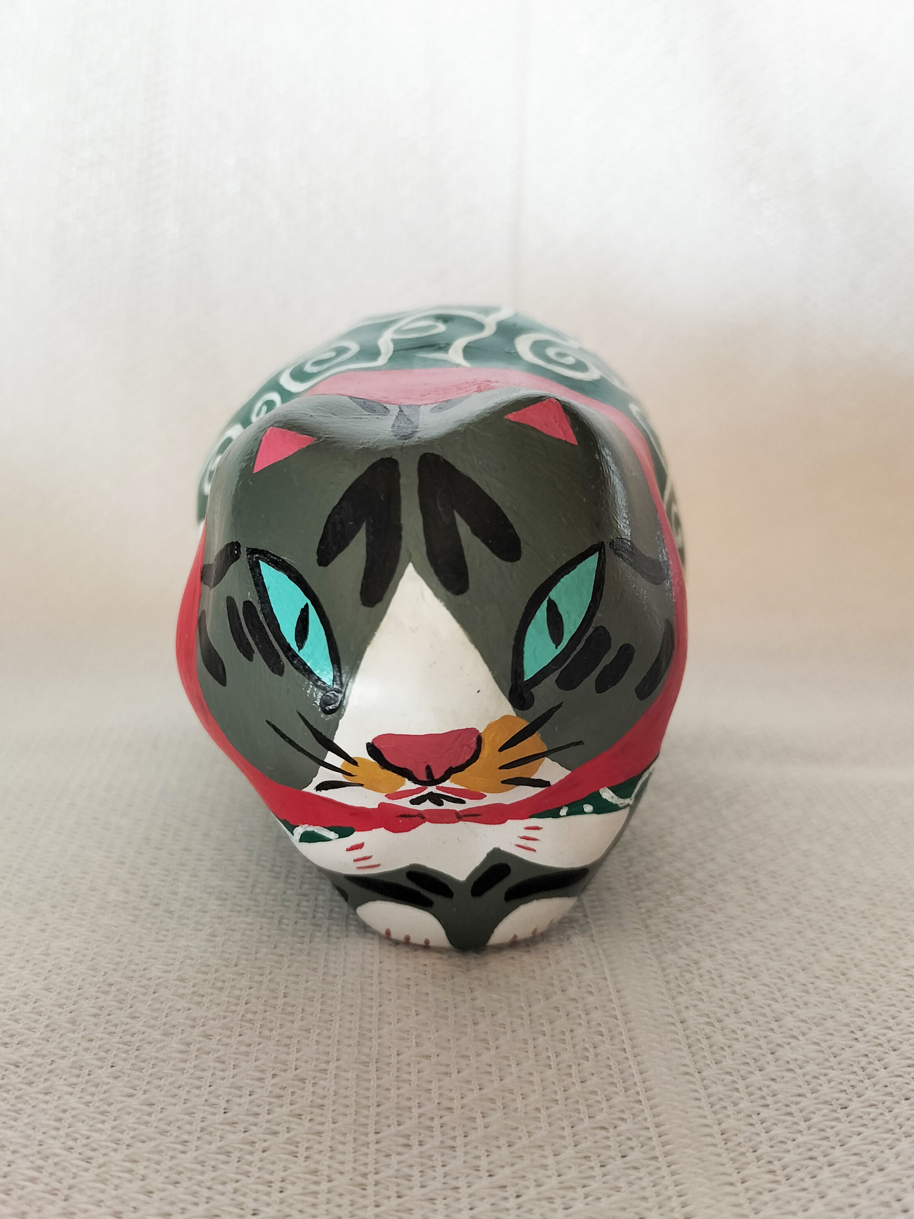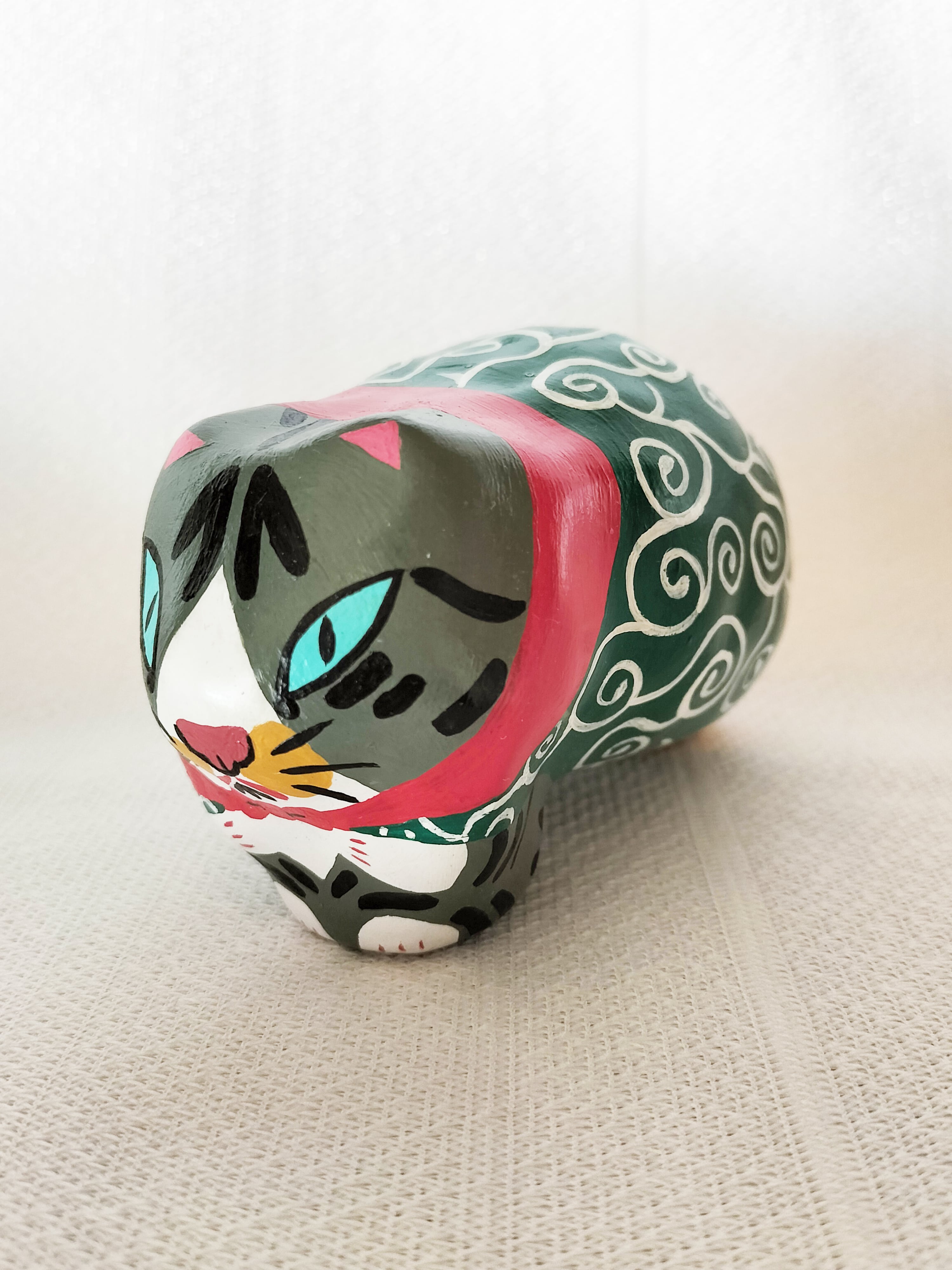 地域猫としてお世話していたきじとらの男の子ぶーちゃんとさび柄の女の子びびちゃんをモデルに、盗人の親分子分にして作った張り子の猫です。