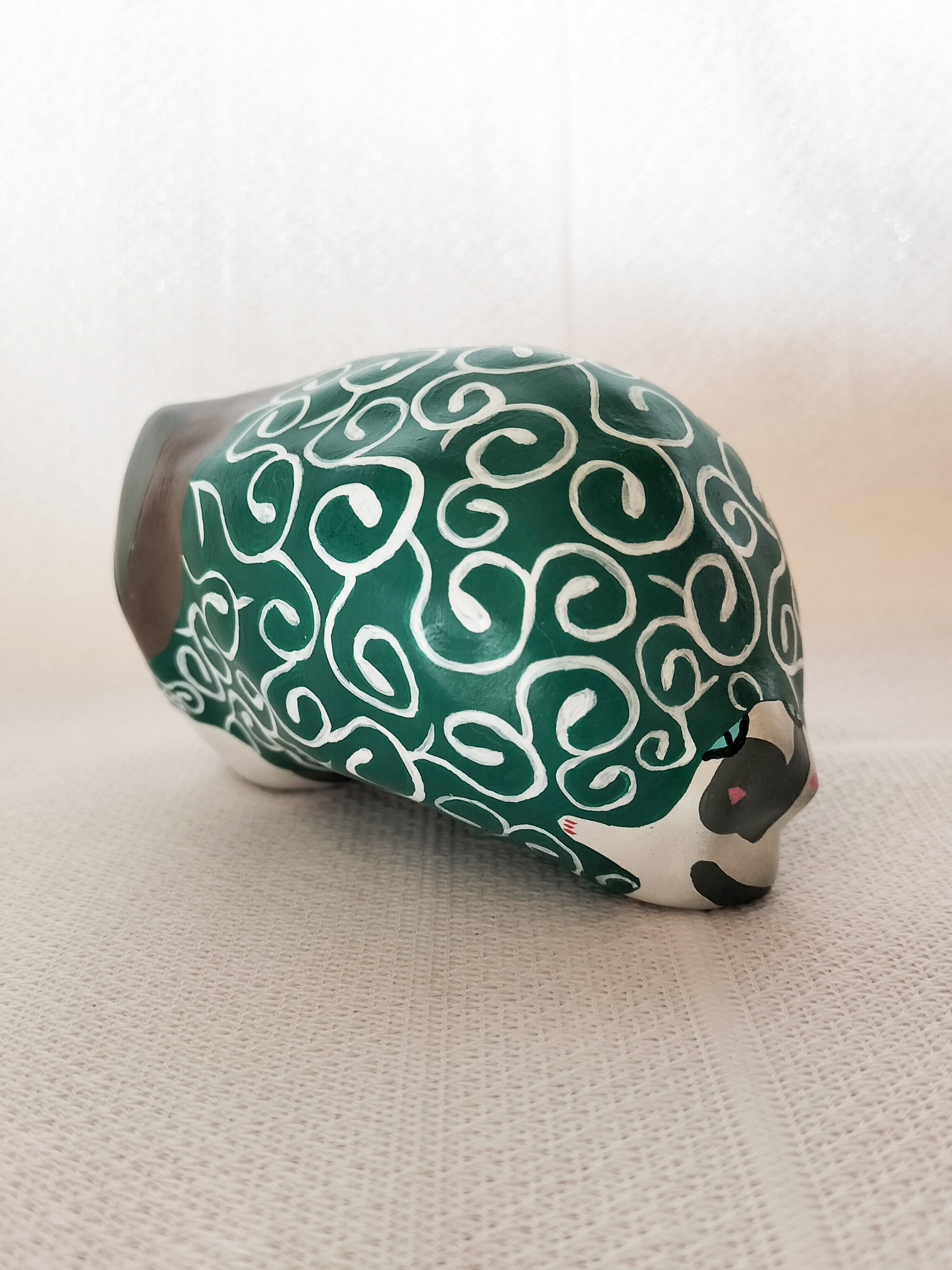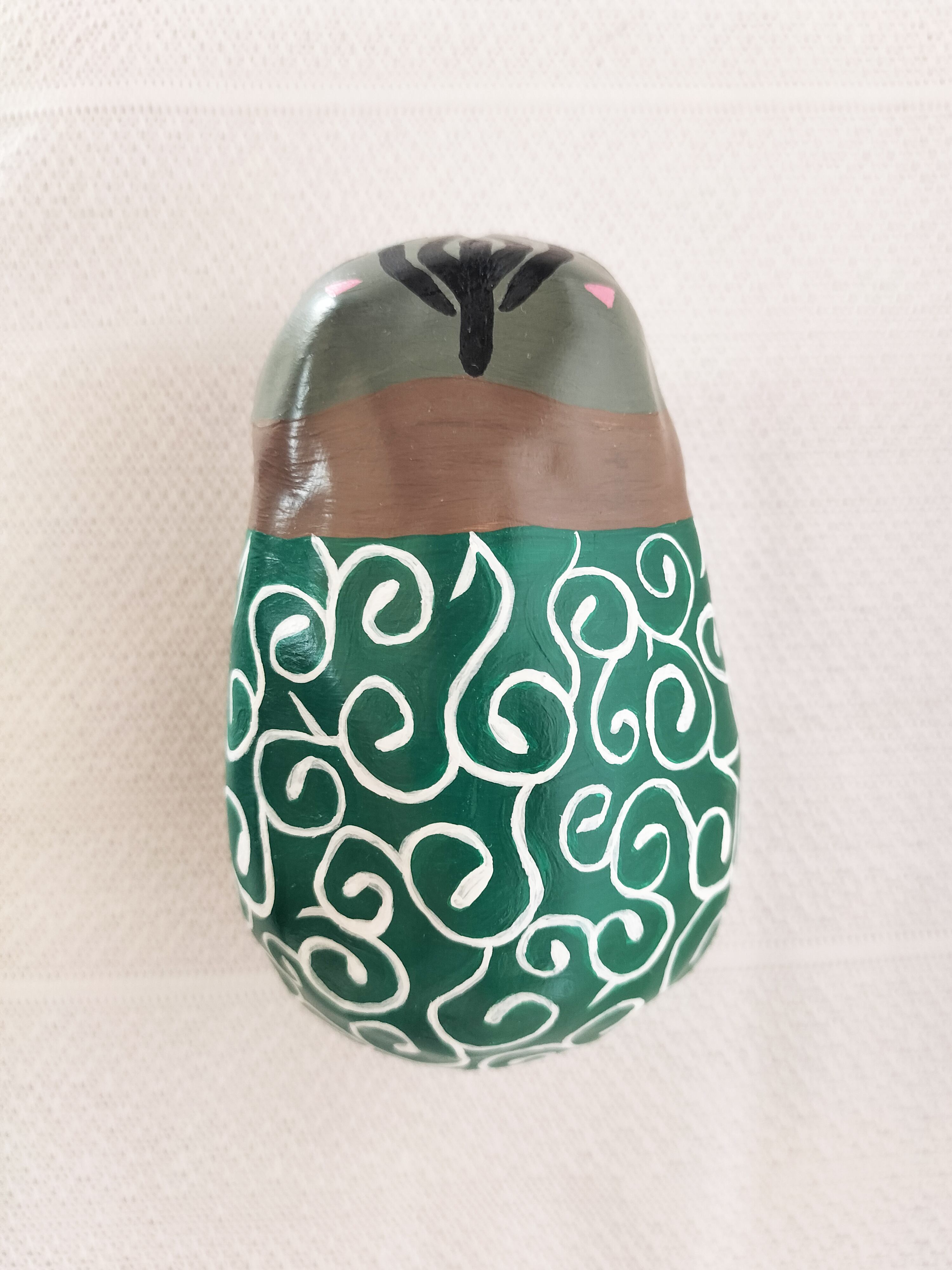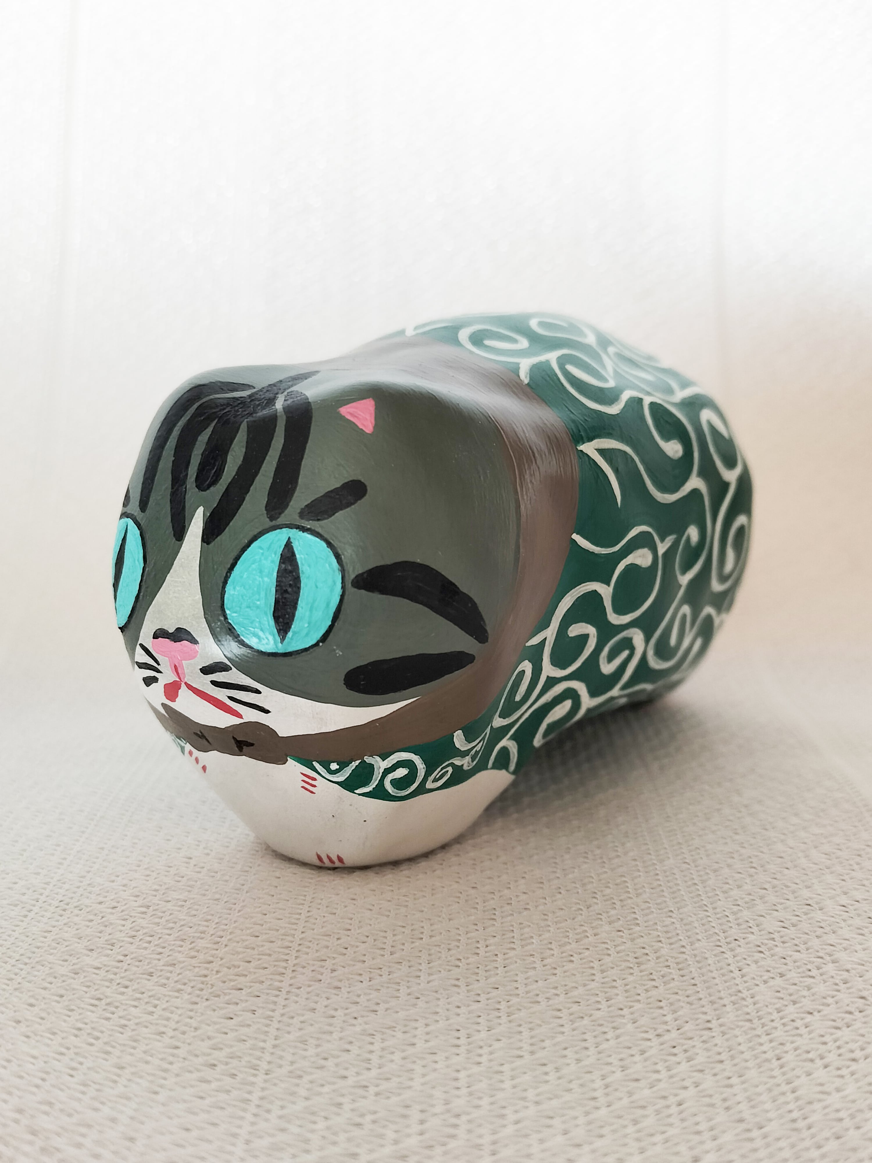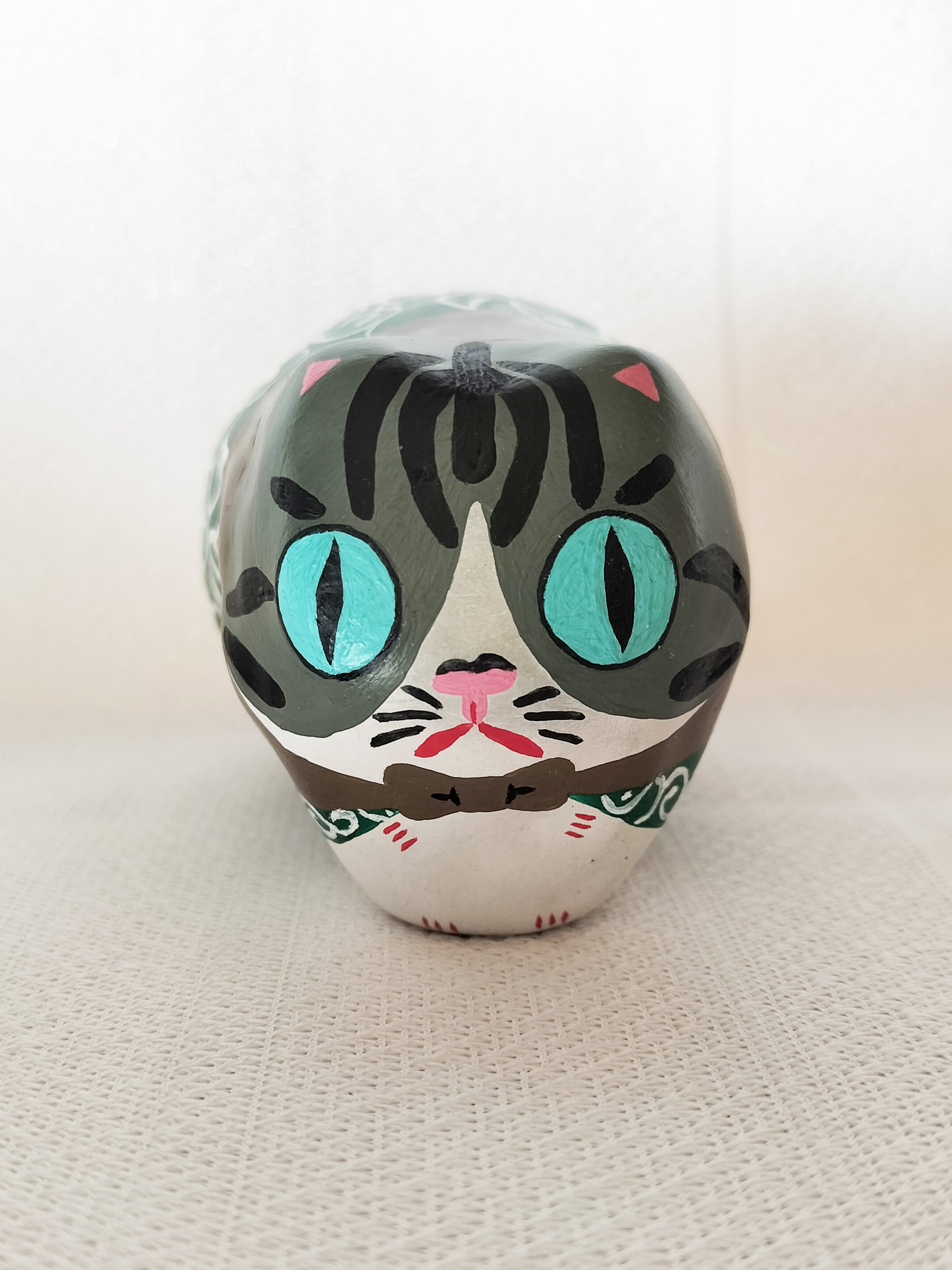 地域猫としてお世話していたきじしろの男の子しまちゃんとぶちの女の子しろちゃんをモデルに、盗人の親分子分にして作った張り子の猫です。